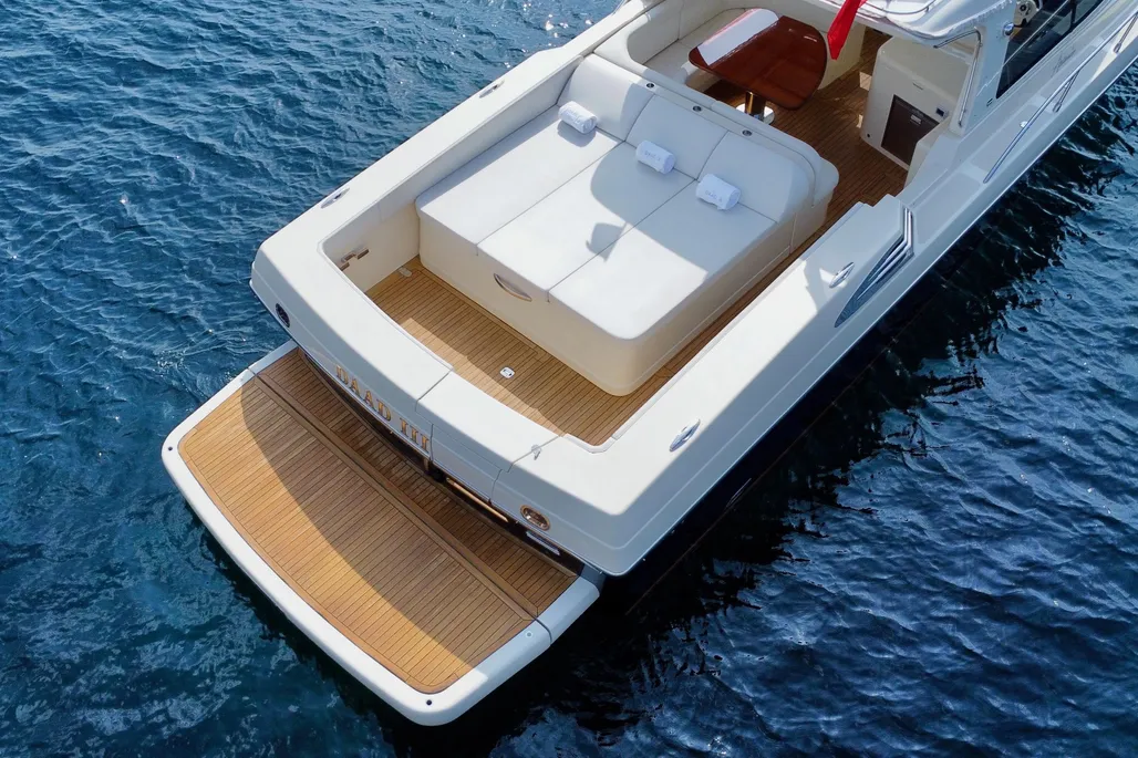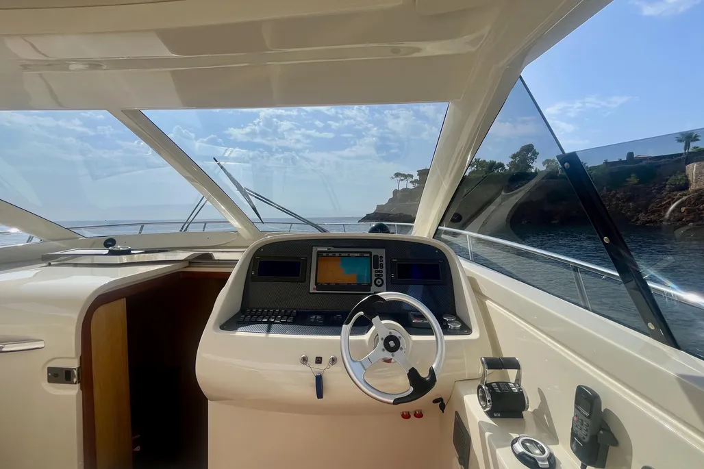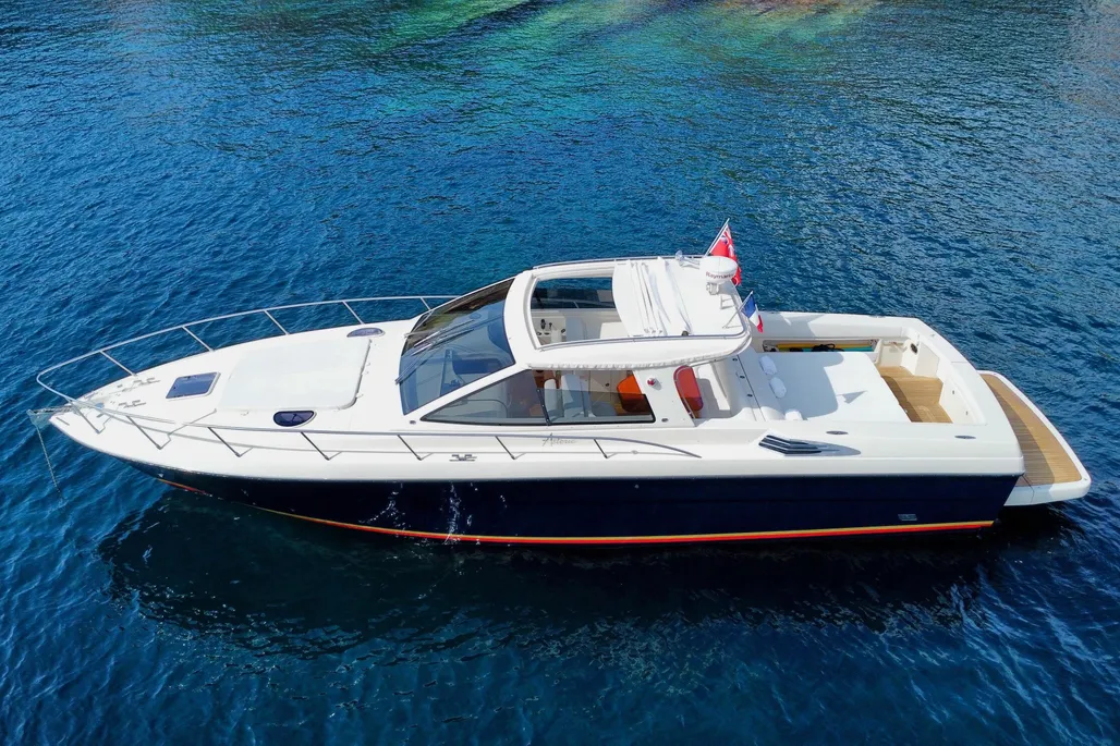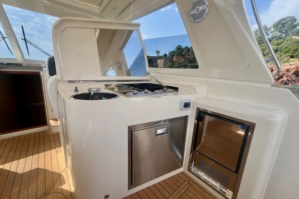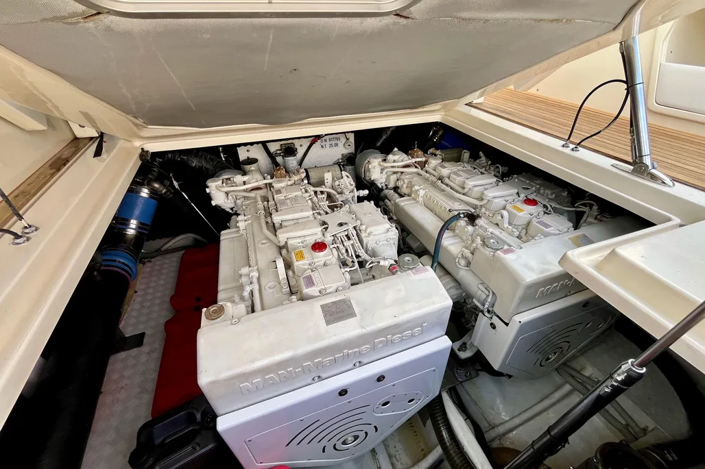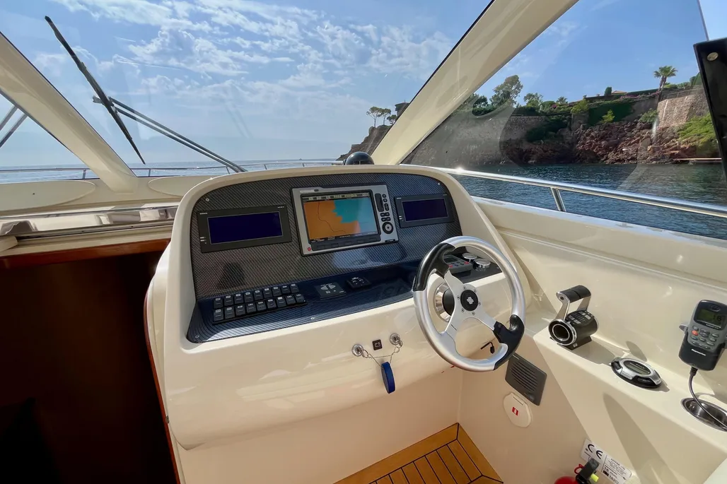 Powered by two 800 hp MANs (approx. 1285 hours), it offers smooth, safe sailing, with performance suited to both fast outings and days at anchor. On board, the spacious cockpit, elegant hard-top and wide aft platform create a convivial outdoor living space, perfectly designed for entertaining.