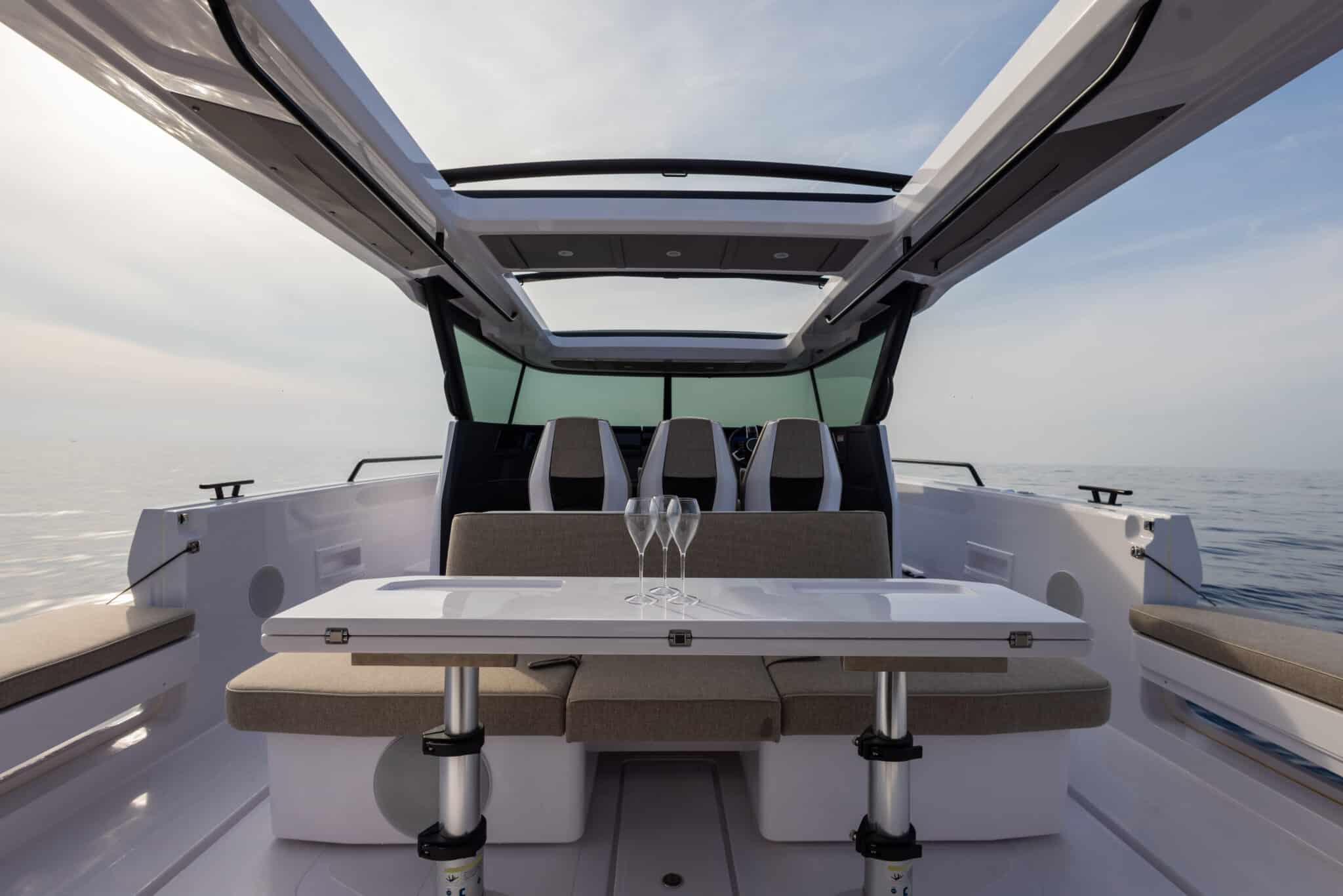 L’Axopar 45 propose un plan de pont moderne et modulable, avec des espaces de détente optimisés et une circulation fluide. Son design ouvert et sa conception intelligente en font un bateau parfaitement adapté aux journées en mer.