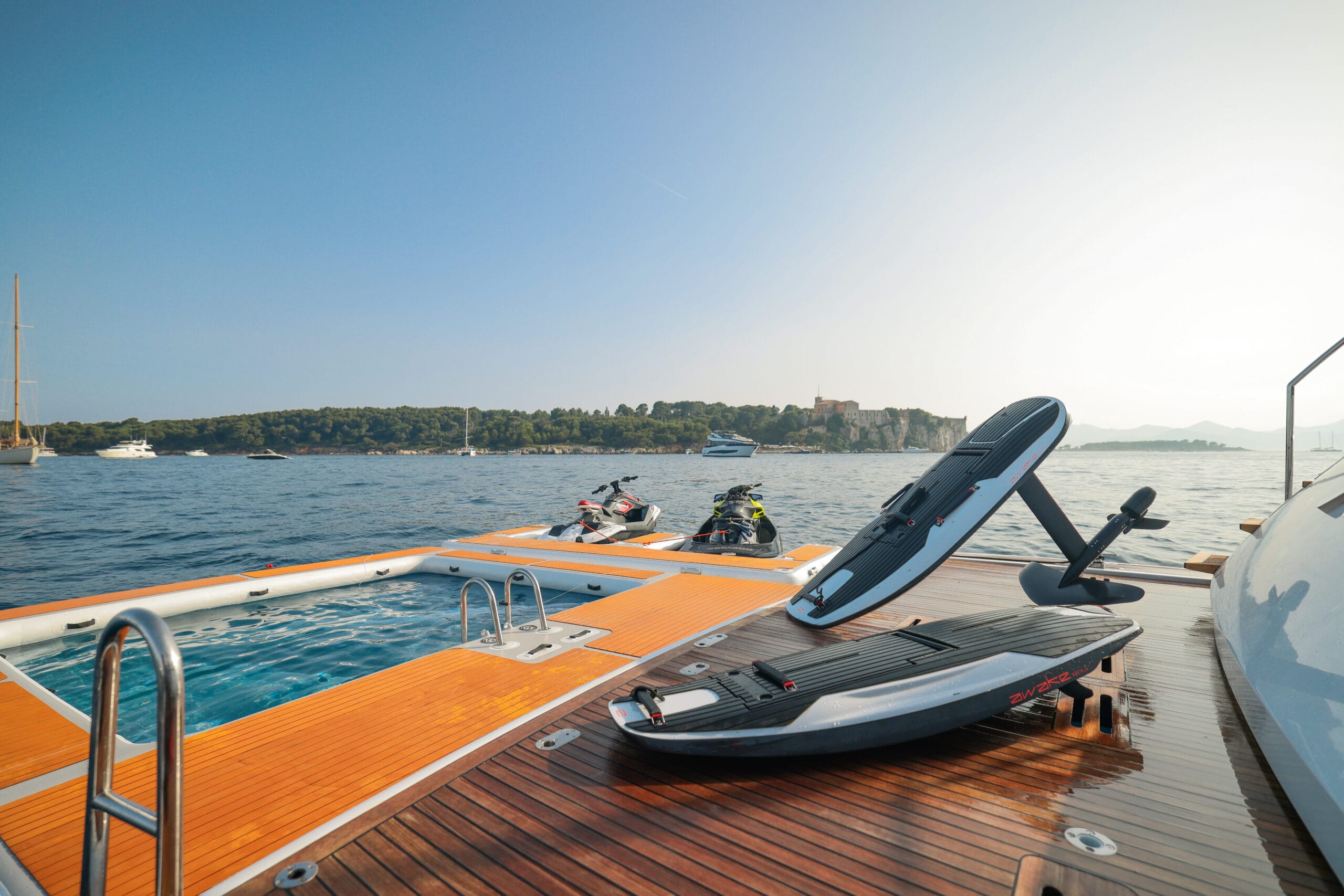 Avec une vitesse maximale de 28 nœuds et des stabilisateurs assurant un excellent confort en navigation, MILLESIME combine performance et douceur de pilotage. À bord, une impressionnante gamme de water toys — e-foil, surf électrique, SeaDoo, paddle, kayak, wakeboard et bien plus — promet des journées rythmées entre baignades et aventures nautiques.