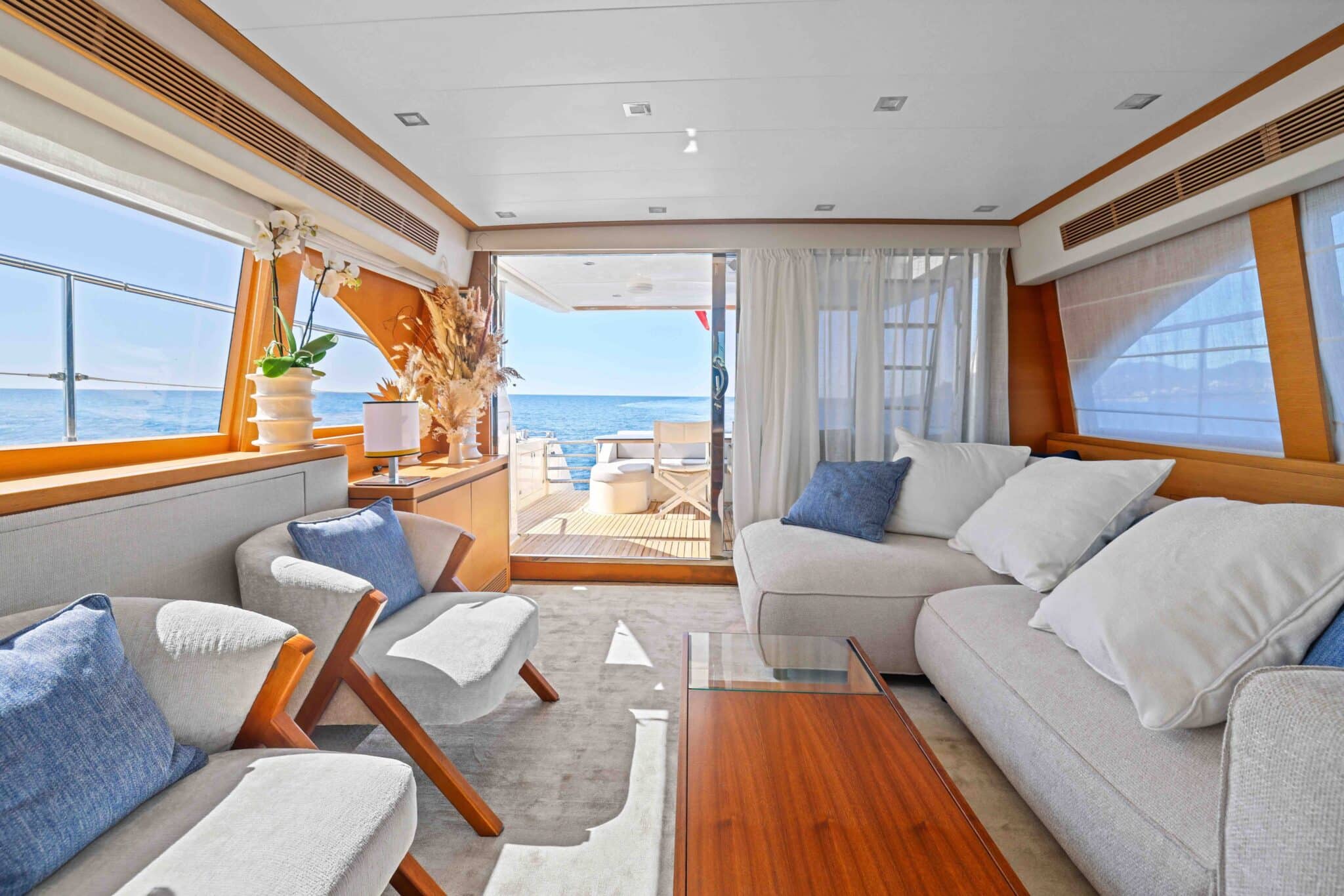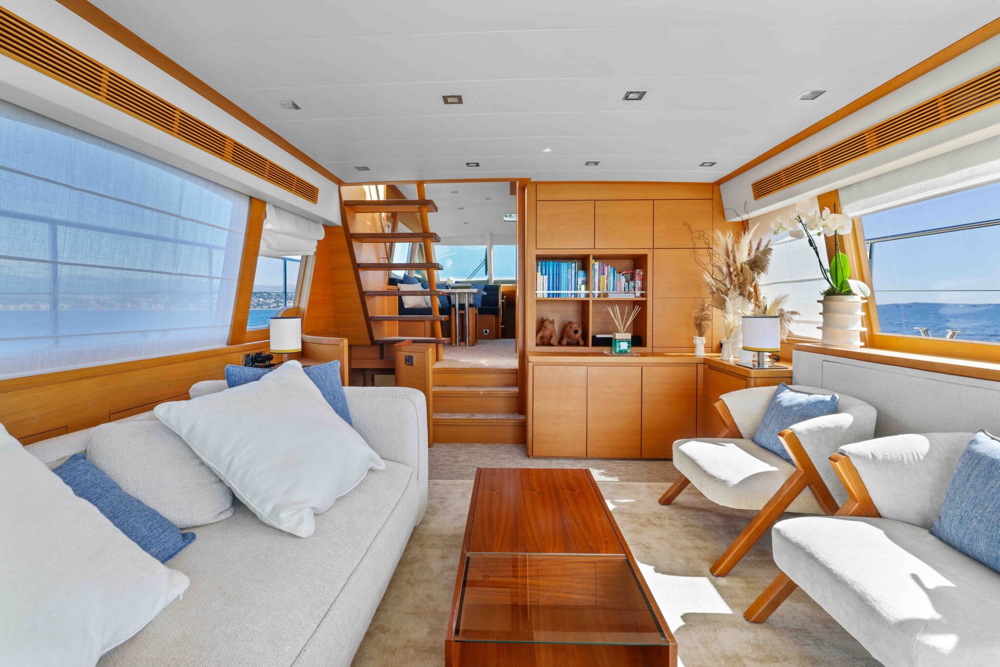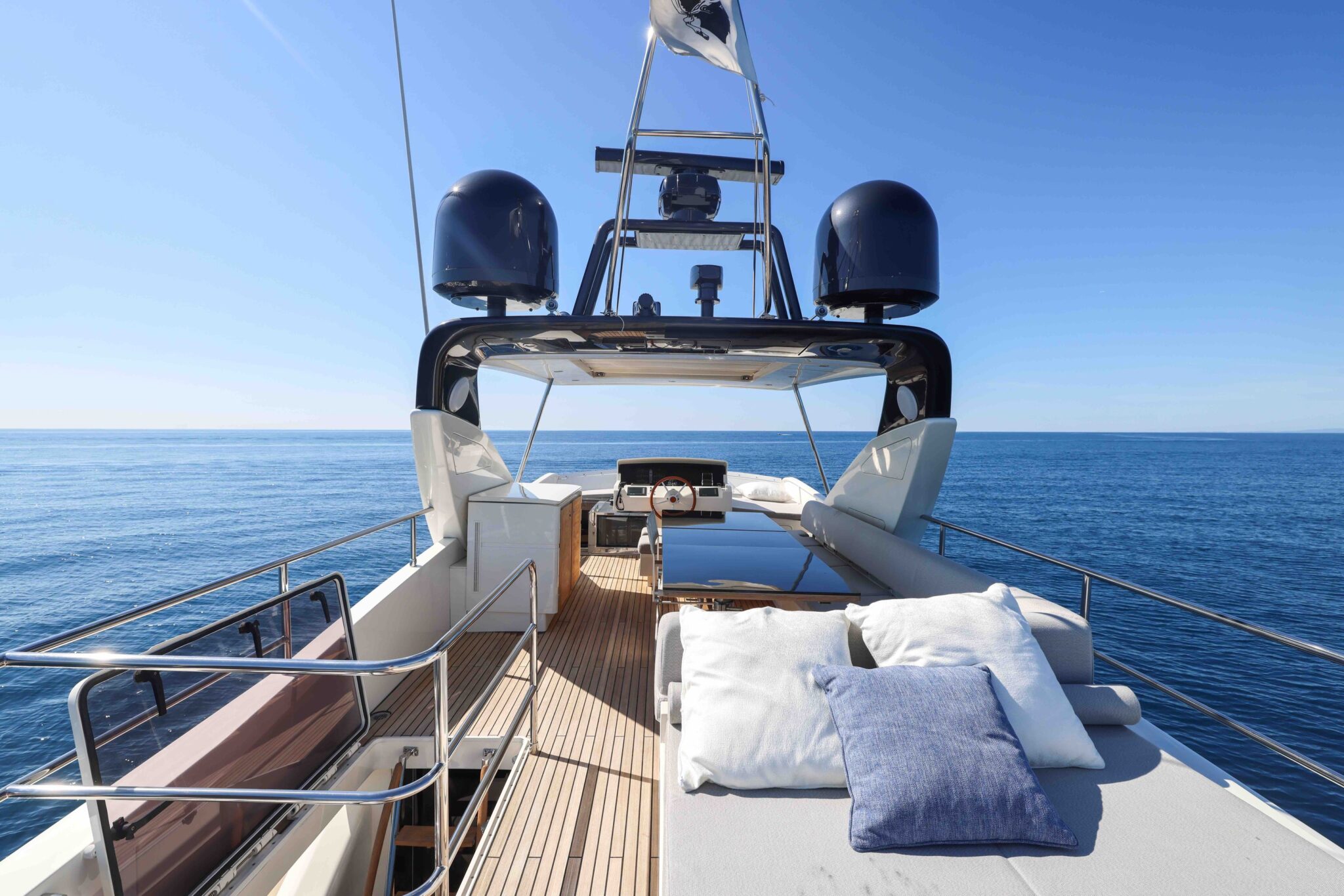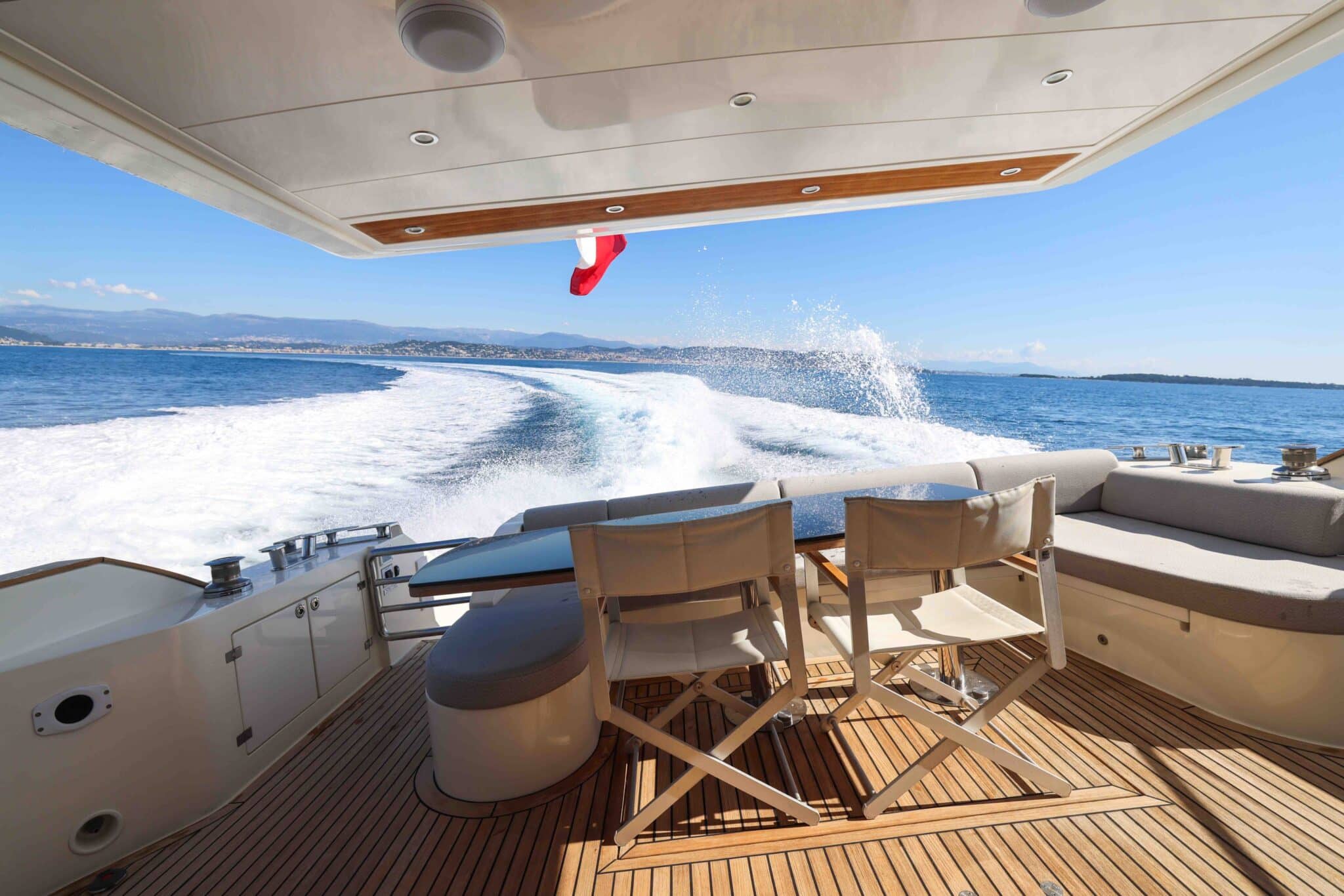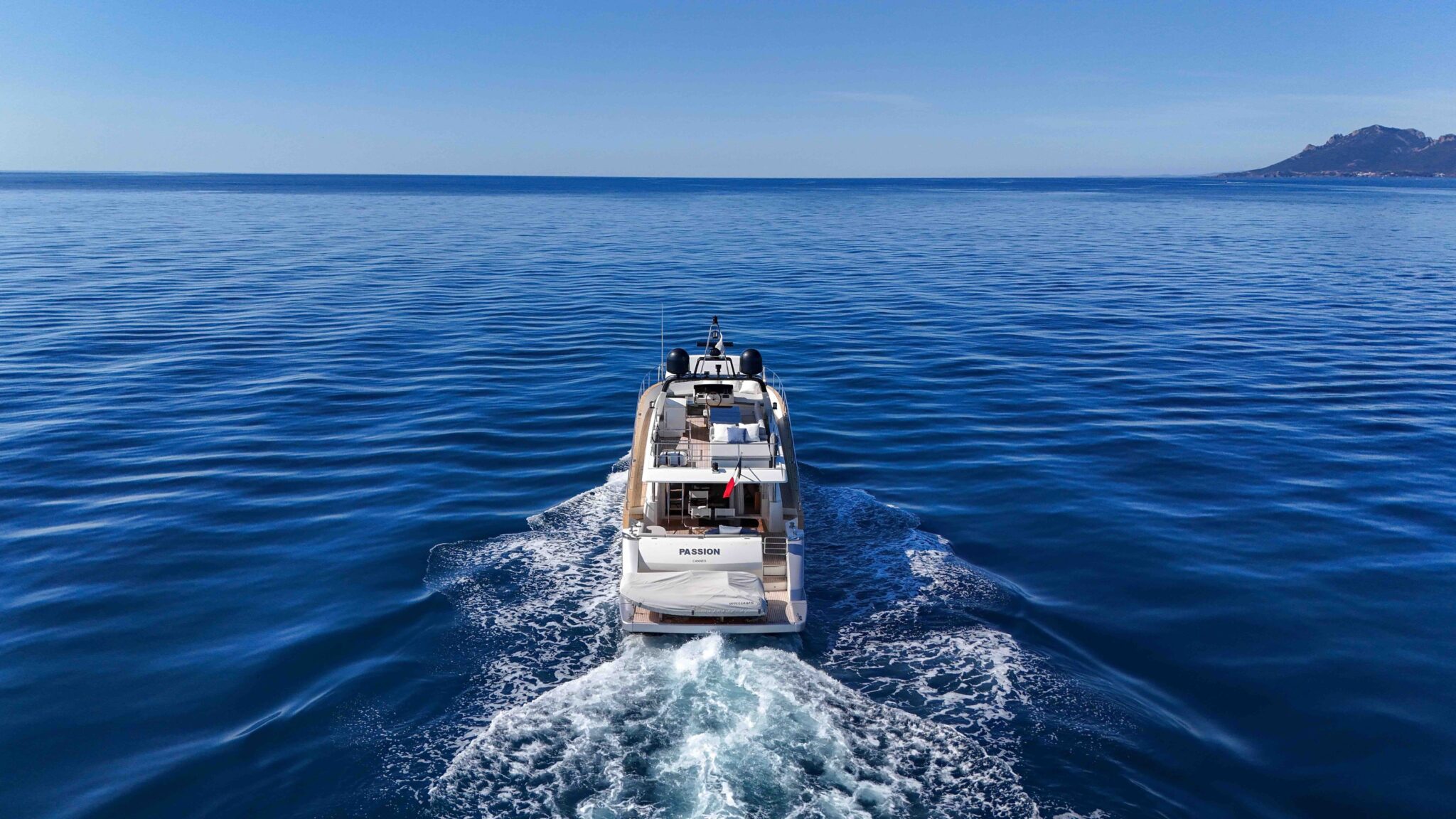 Le PASSION se distingue notamment par son flybridge spacieux avec zones lounge et bains de soleil, ainsi que par ses espaces extérieurs parfaitement adaptés à une journée en mer conviviale et élégante.