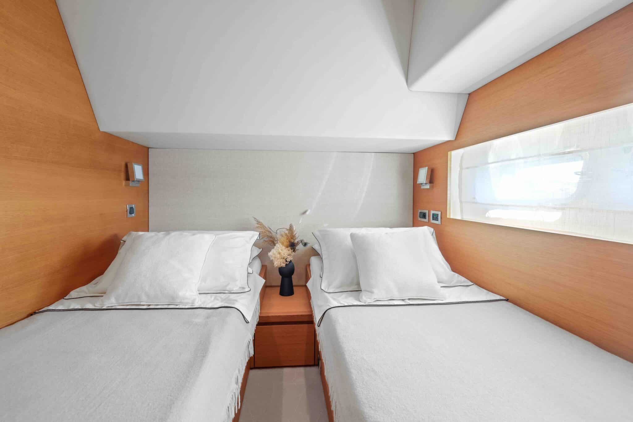 Sa configuration en 4 cabines permet également d’accueillir jusqu’à 8 invités pour la nuit, offrant une solution adaptée aux séjours prolongés en mer.