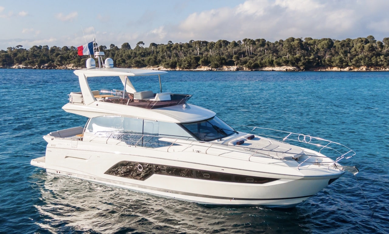 Le Prestige 590 fait partie des yachts les plus recherchés pour une journée confortable et spacieuse sur la Côte d’Azur.