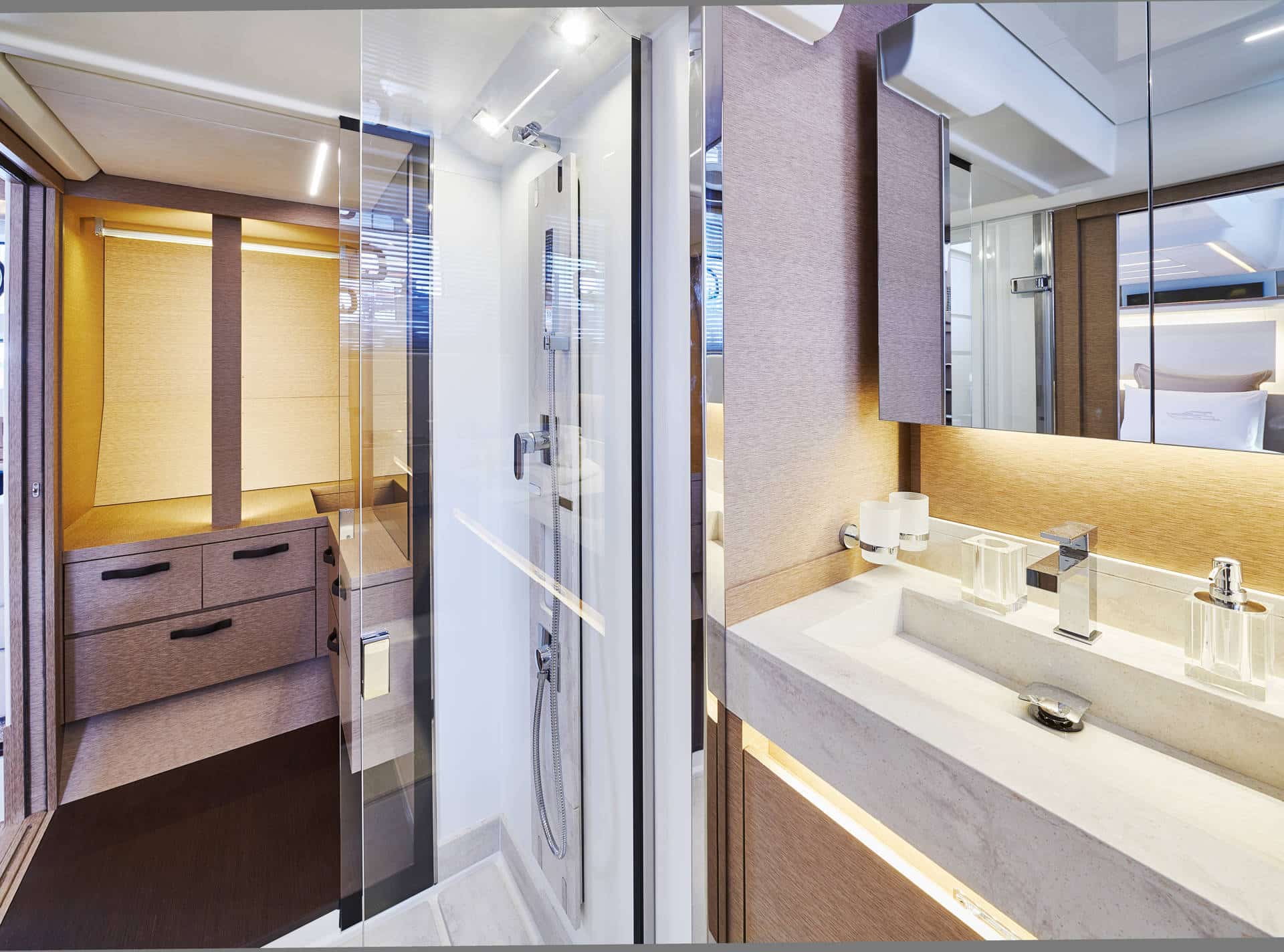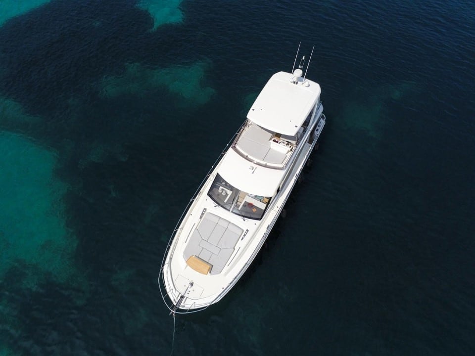 Le Prestige 590 propose un cockpit arrière spacieux avec coin repas convivial, complété par un flybridge offrant une vue panoramique exceptionnelle. À l’avant, les bains de soleil permettent de profiter pleinement du soleil, dans une atmosphère élégante et détendue.