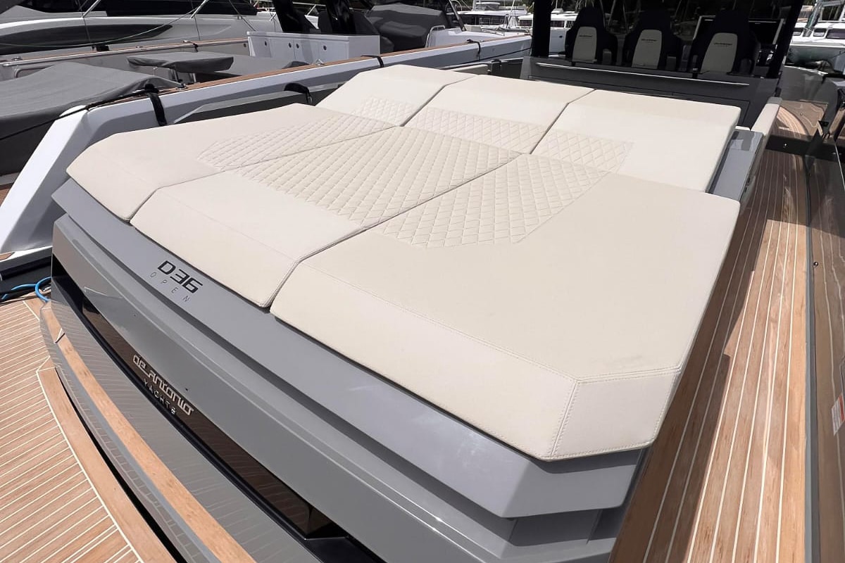 Le De Antonio D36 propose un plan de pont optimisé avec de larges bains de soleil à l’avant et à l’arrière, ainsi qu’un espace central convivial. Sa conception intelligente permet une circulation fluide et une expérience idéale pour les journées en mer.