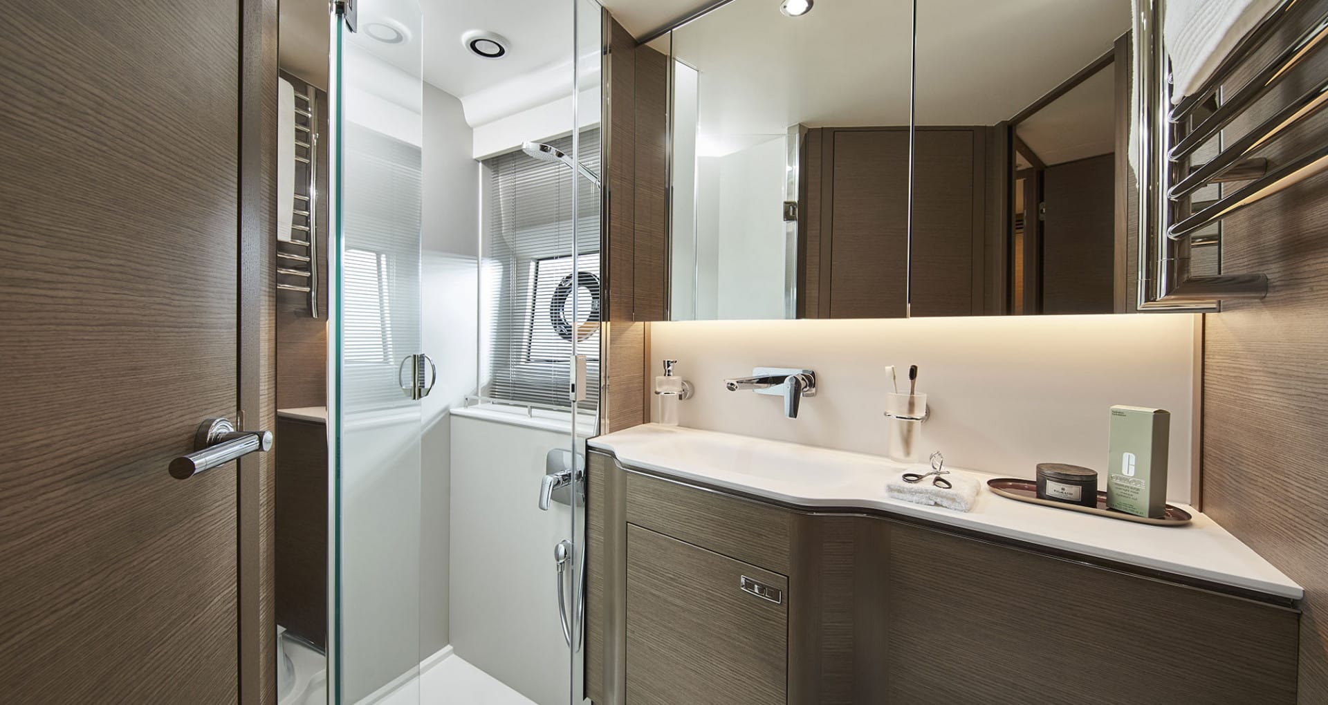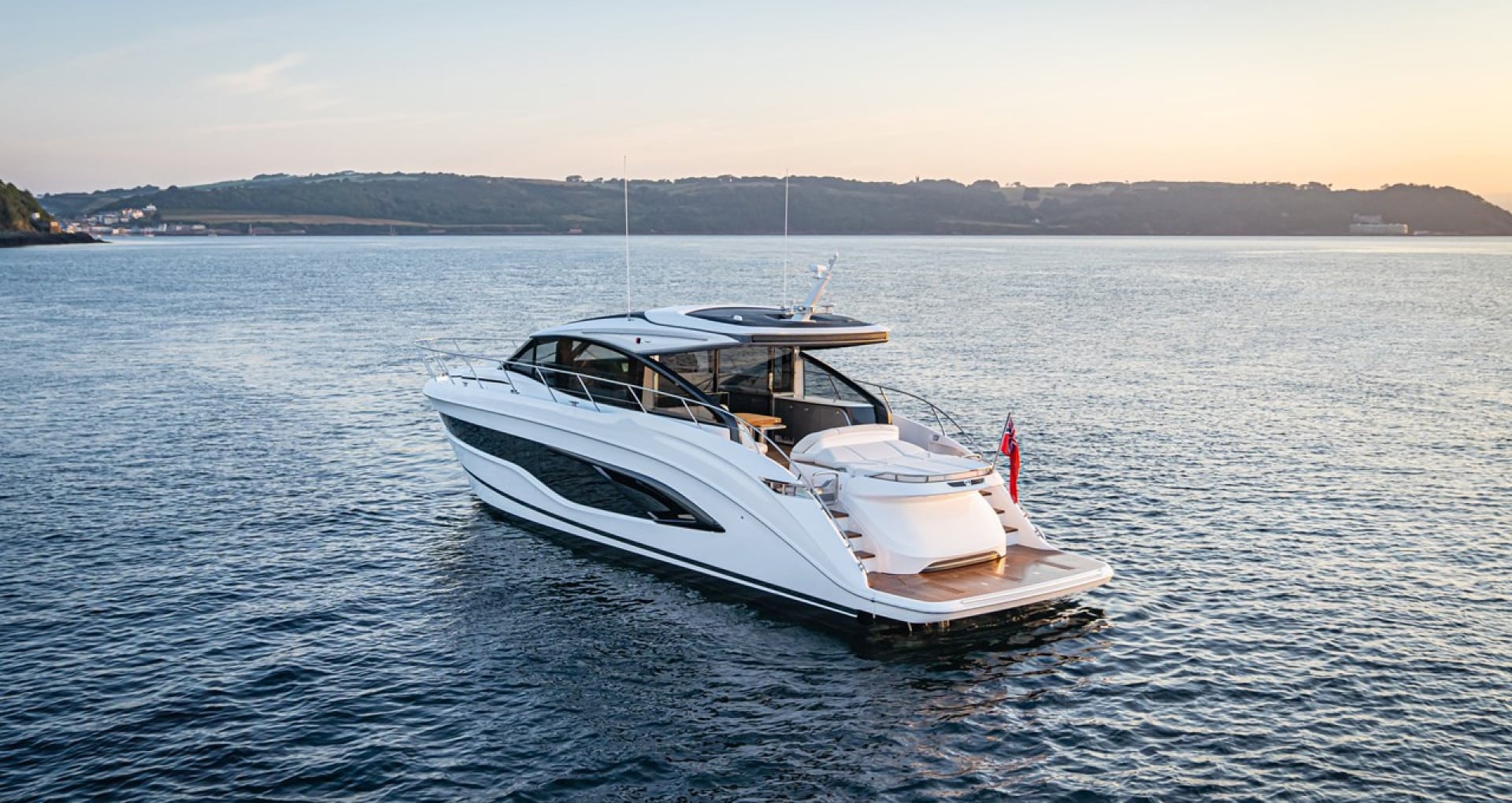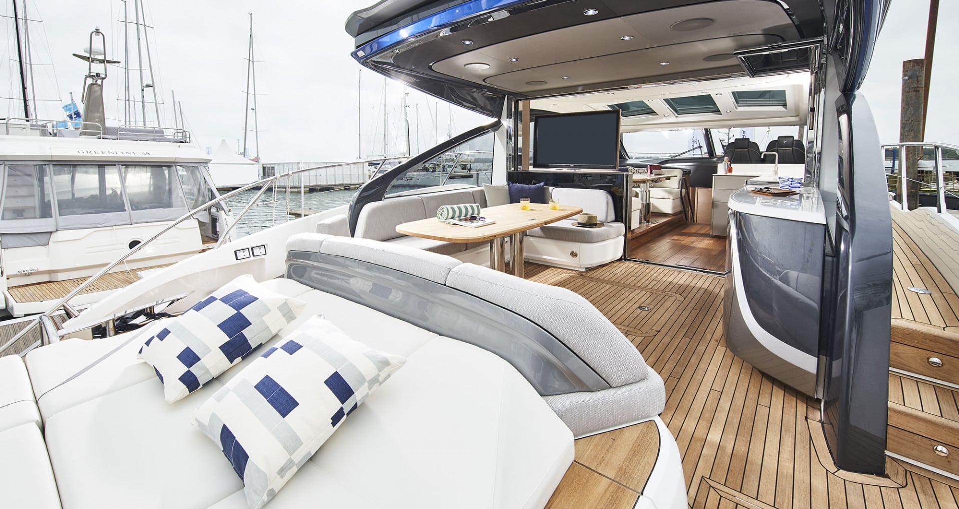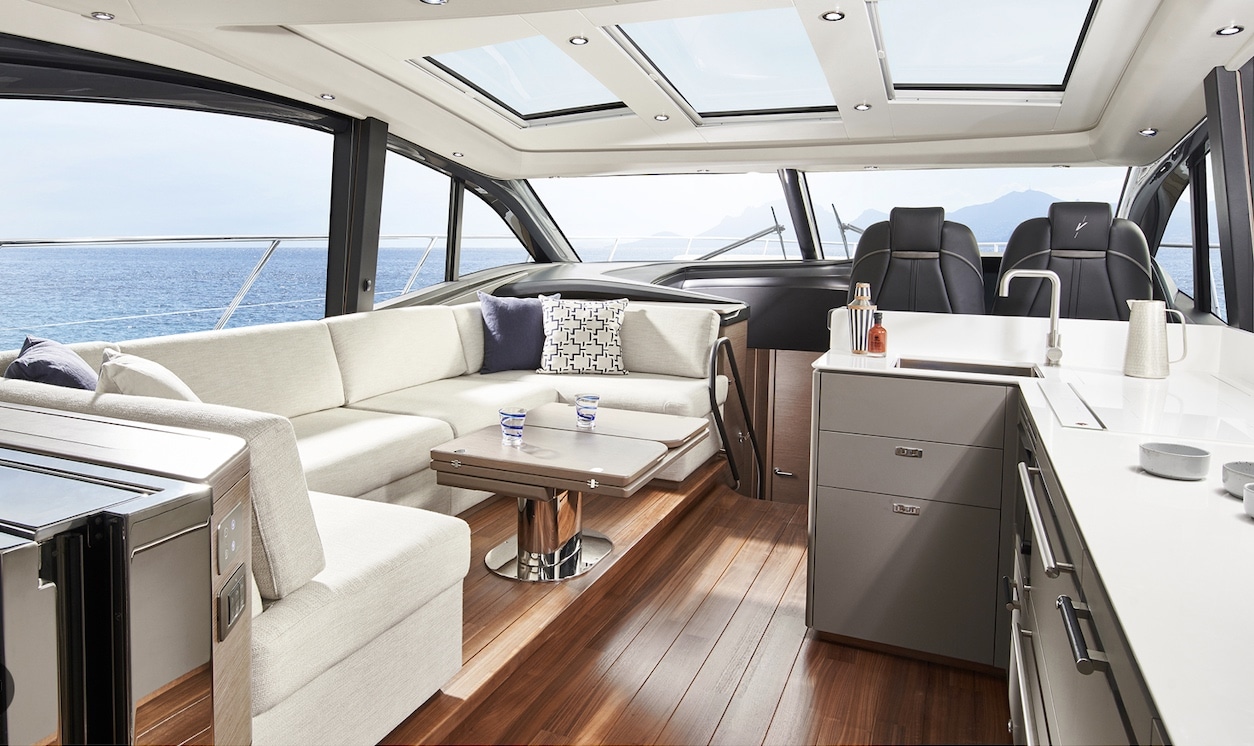Le Princess V55 propose un cockpit ouvert avec coin repas convivial, un bain de soleil arrière et un espace avant dédié à la détente. L’ensemble crée une circulation fluide et une expérience à bord dynamique, parfaitement adaptée à une journée en mer.