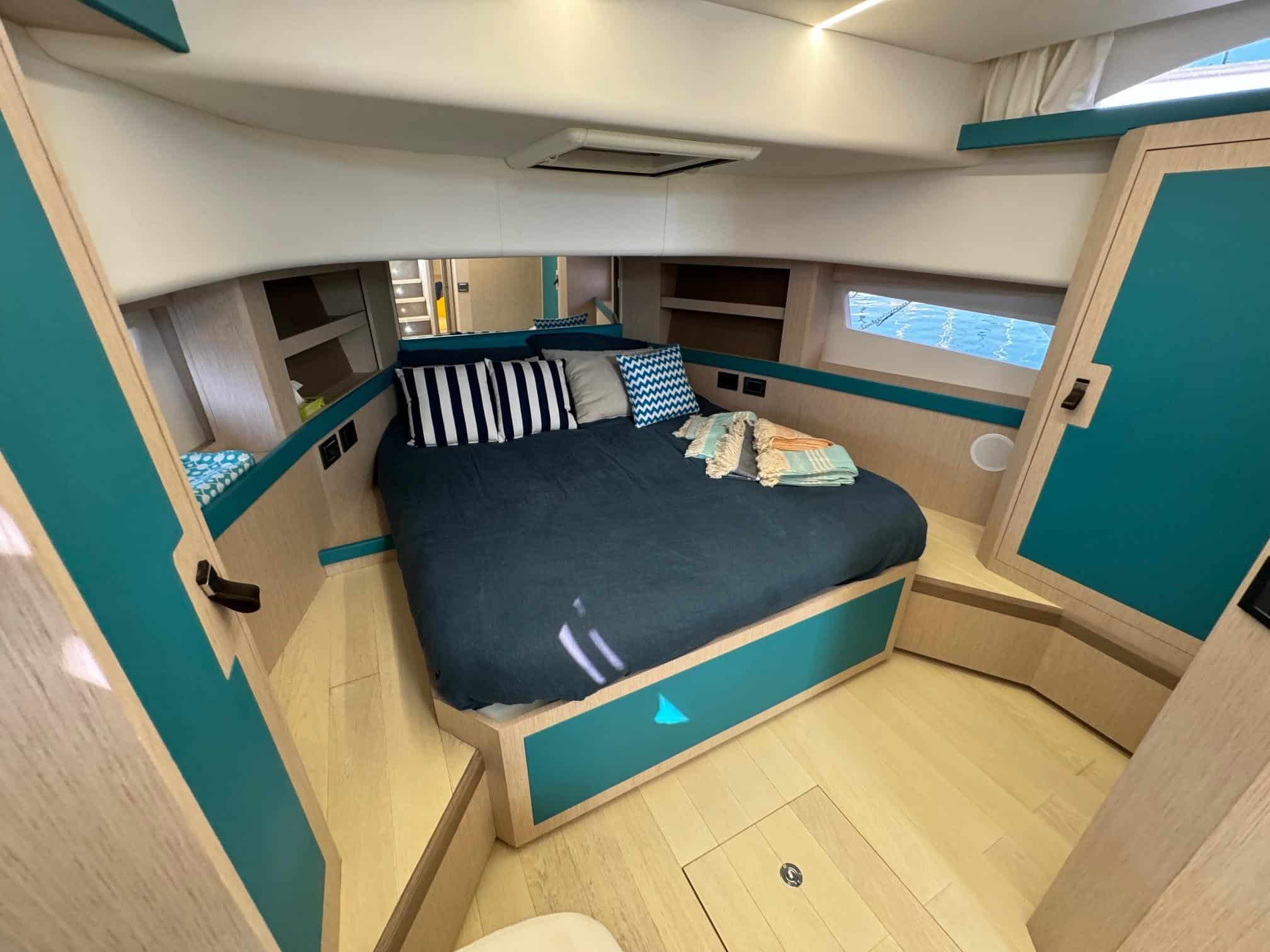 L’intérieur révèle deux cabines lumineuses, une salle d’eau élégante et un carré épuré aux finitions soignées. Les matériaux nobles, la hauteur sous plafond et la ventilation naturelle assurent un confort remarquable pour prolonger les moments en mer.