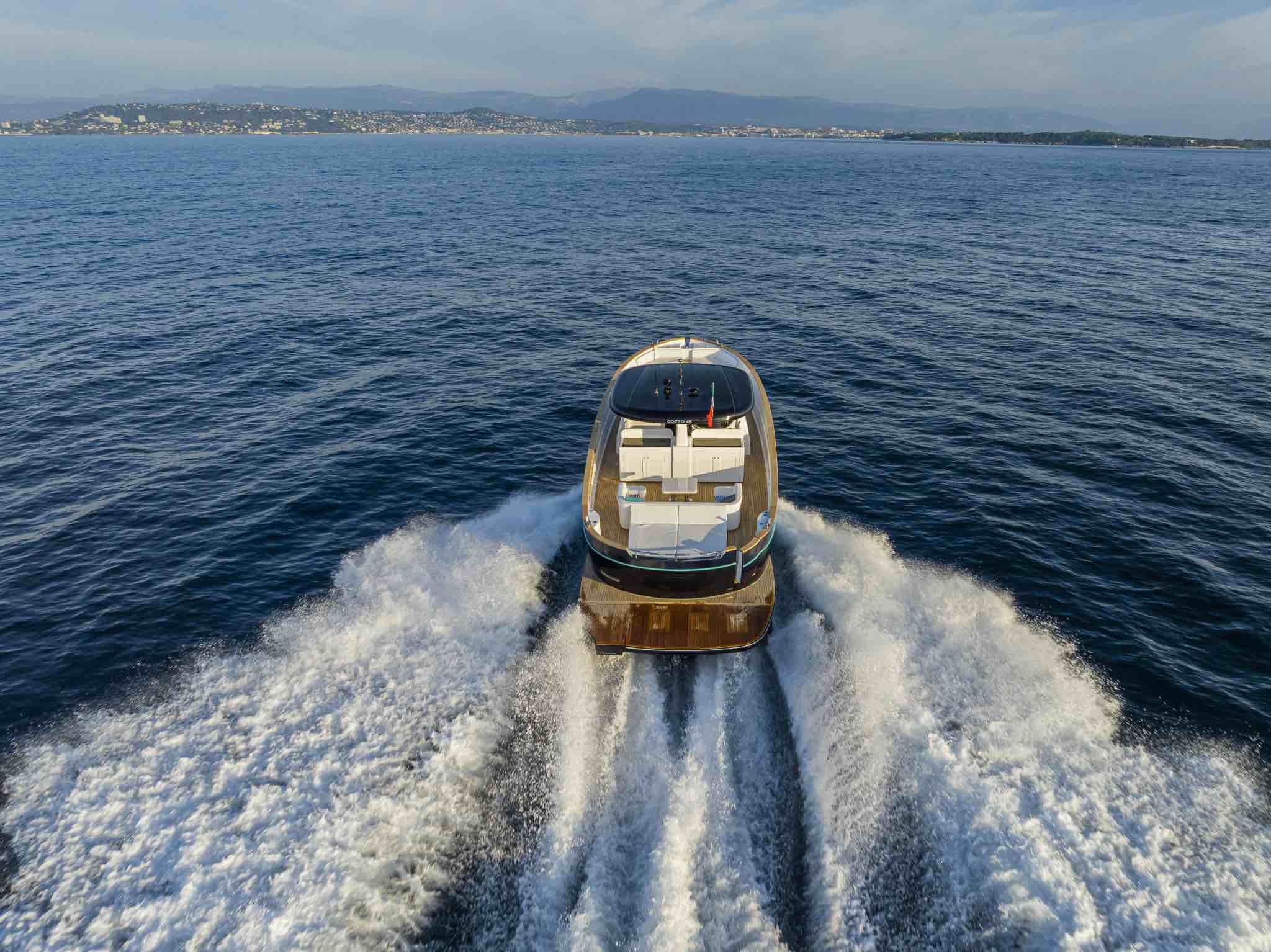 Son pont spacieux en teck accueille un vaste bain de soleil avant, un salon extérieur ombragé et une large plateforme de baignade. Les lignes douces, la coque planante et les finitions artisanales créent une esthétique rare, intemporelle et typiquement méditerranéenne.
