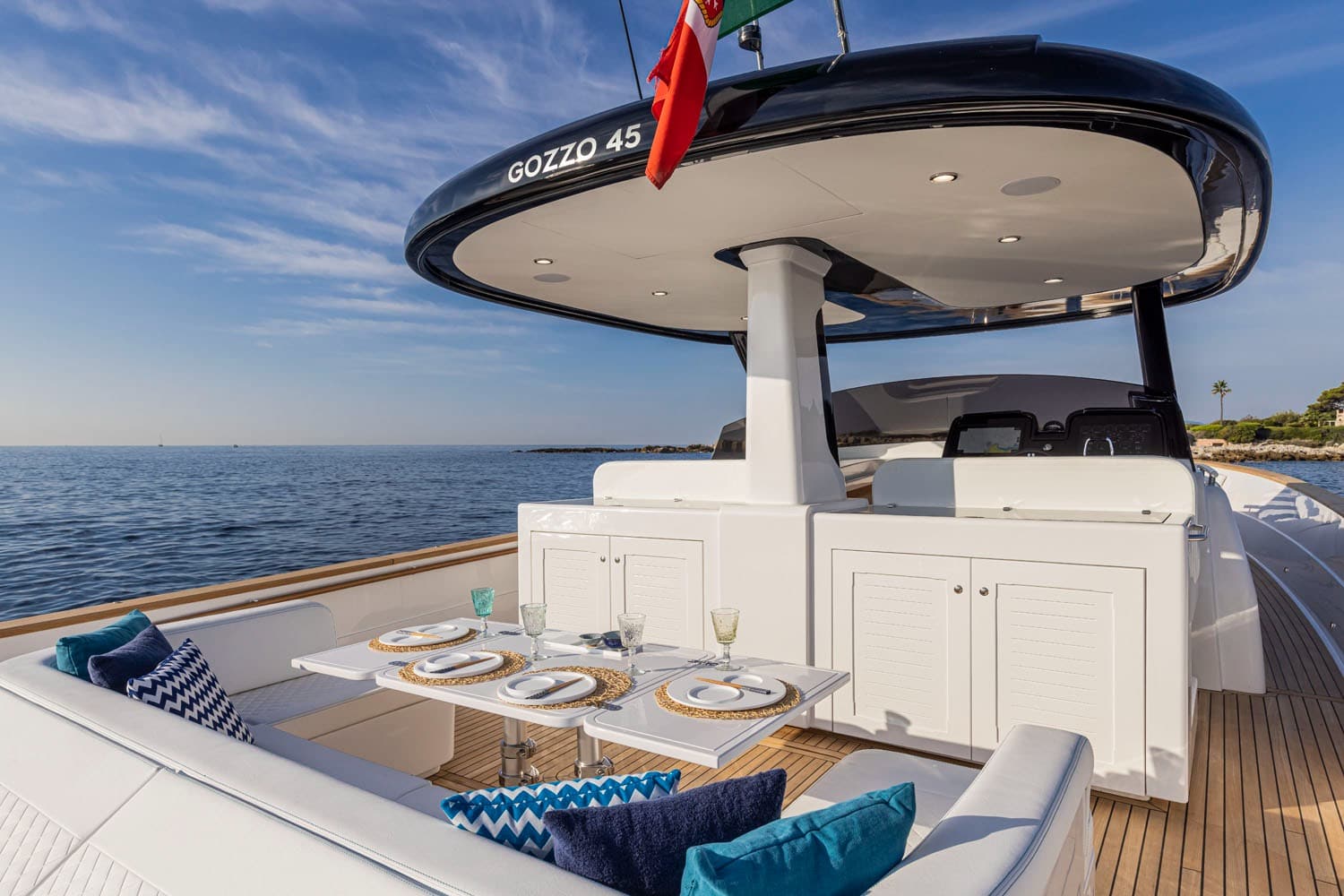 Entre tradition nautique italienne et touches contemporaines, le Gozzo 45 est le compagnon idéal pour ceux qui recherchent une parenthèse chic et apaisante sur les eaux azuréennes.