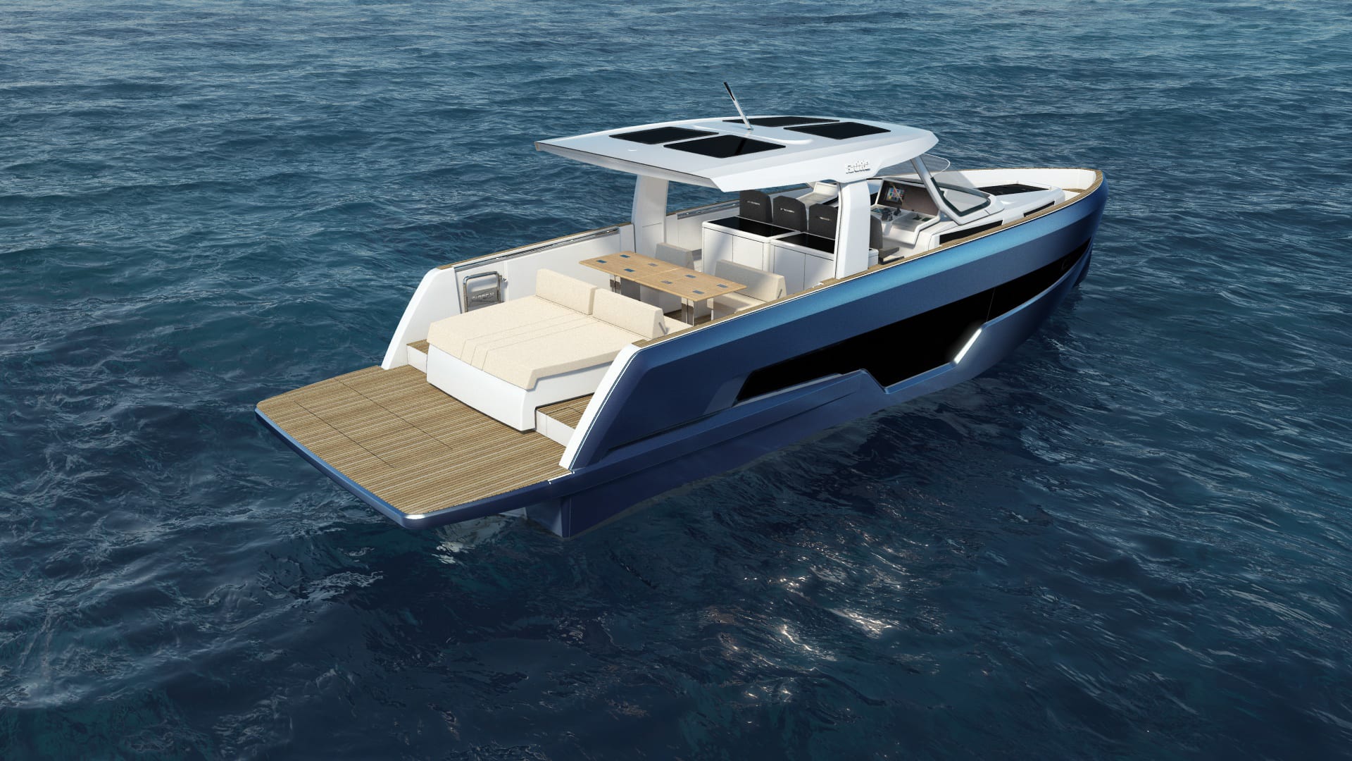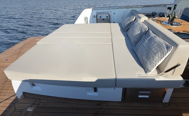 Son plan de pont est un modèle d’ergonomie : vaste plateforme arrière, deux bains de soleil modulables, carré central ombragé avec cuisine extérieure, et une circulation fluide de la proue à la poupe. Idéal pour accueillir jusqu’à 12 invités dans un confort total.