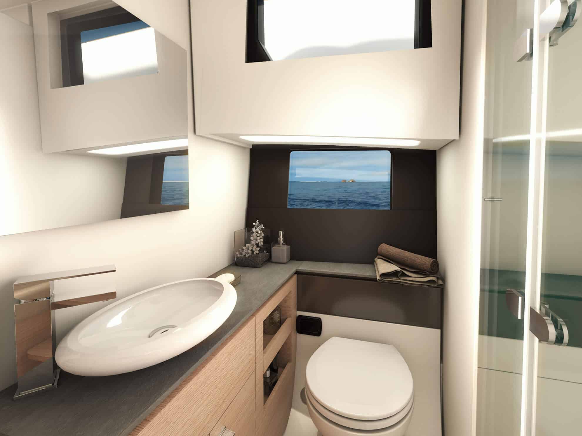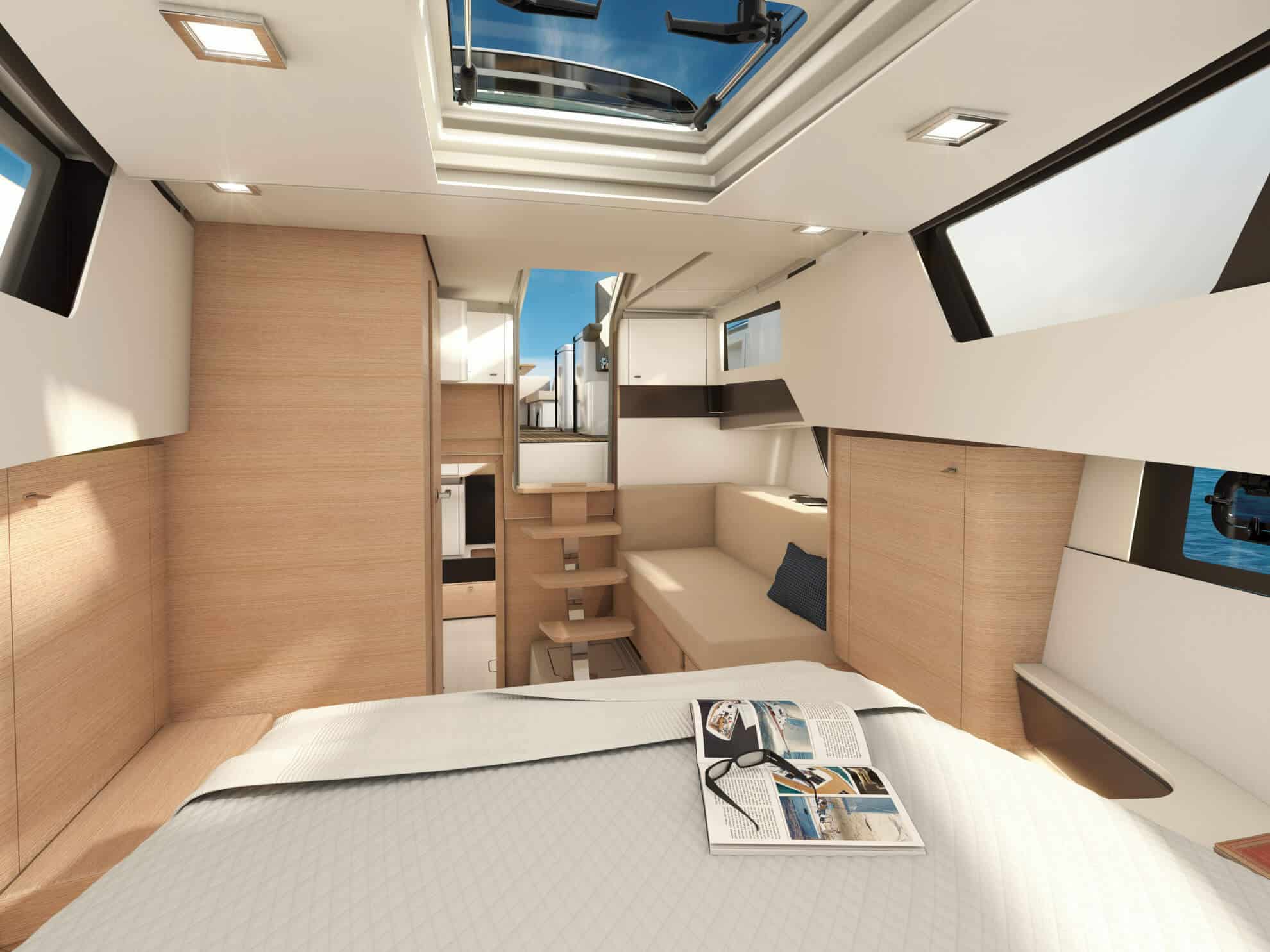 Le Fjord 41 XL propose deux cabines élégantes, une salle d’eau design et une belle hauteur sous plafond. L’atmosphère intérieure, minimaliste et chaleureuse, reflète la signature scandinave du chantier Fjord.