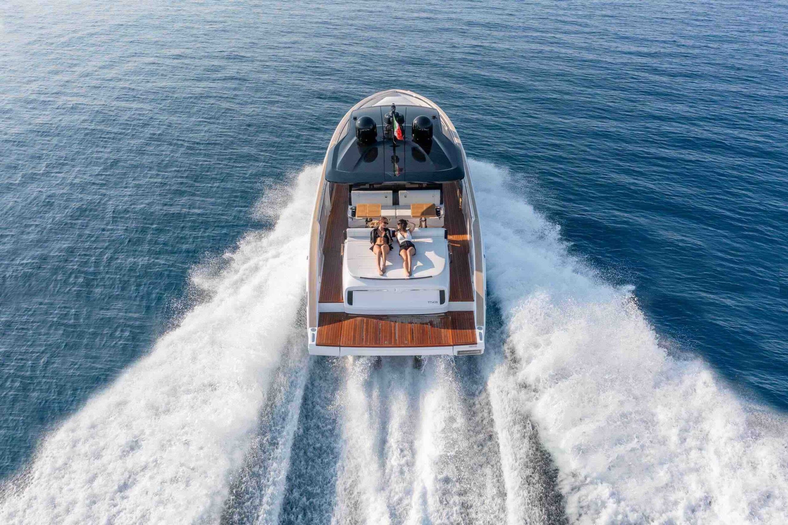 Son plan de pont est pensé pour la détente et la convivialité : bain de soleil arrière prolongé par une plateforme de baignade intégrée, carré central avec coin repas, cuisine extérieure et poste de pilotage ergonomique sous un hard-top aux lignes tendues. À l’avant, un second bain de soleil complète l’espace.