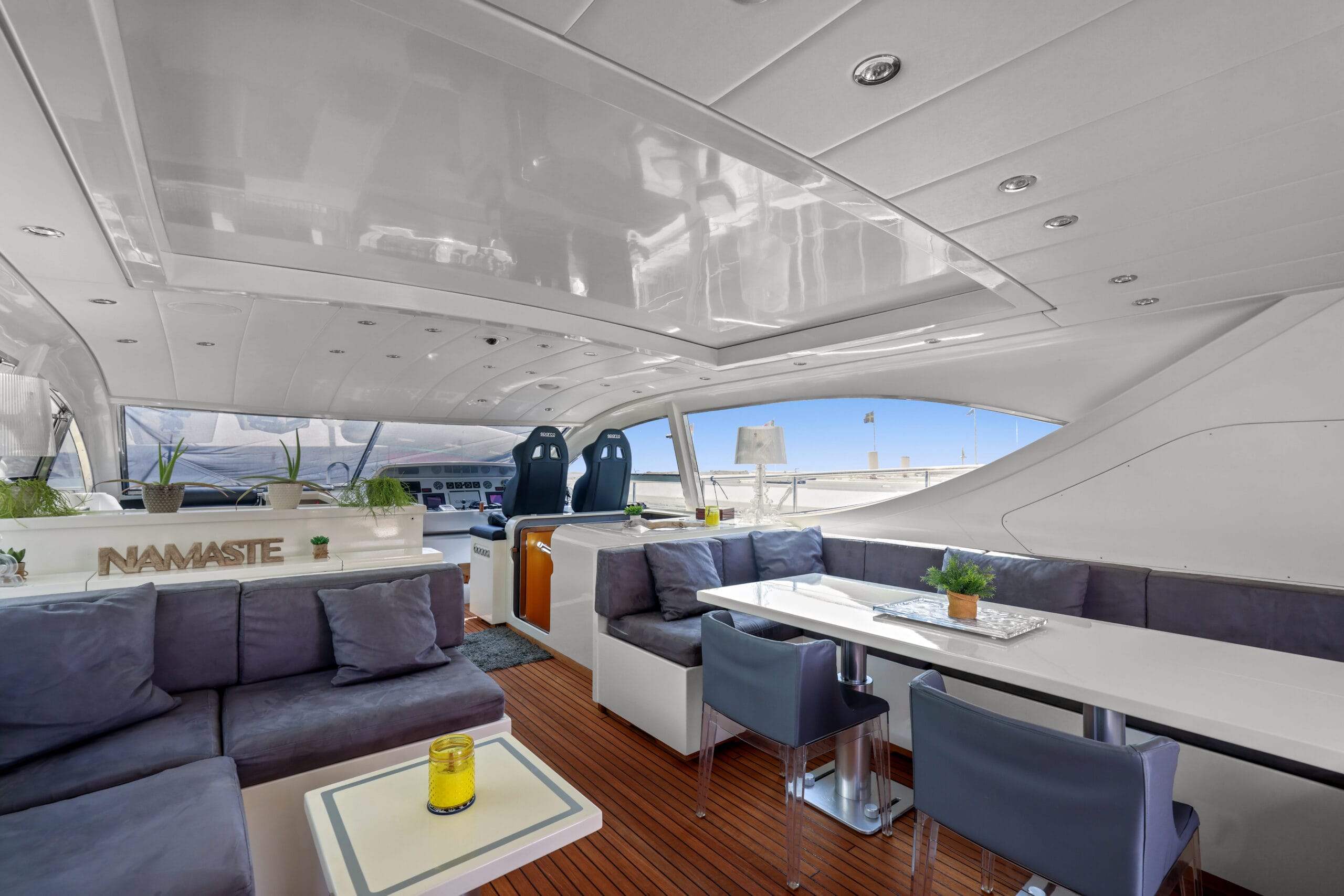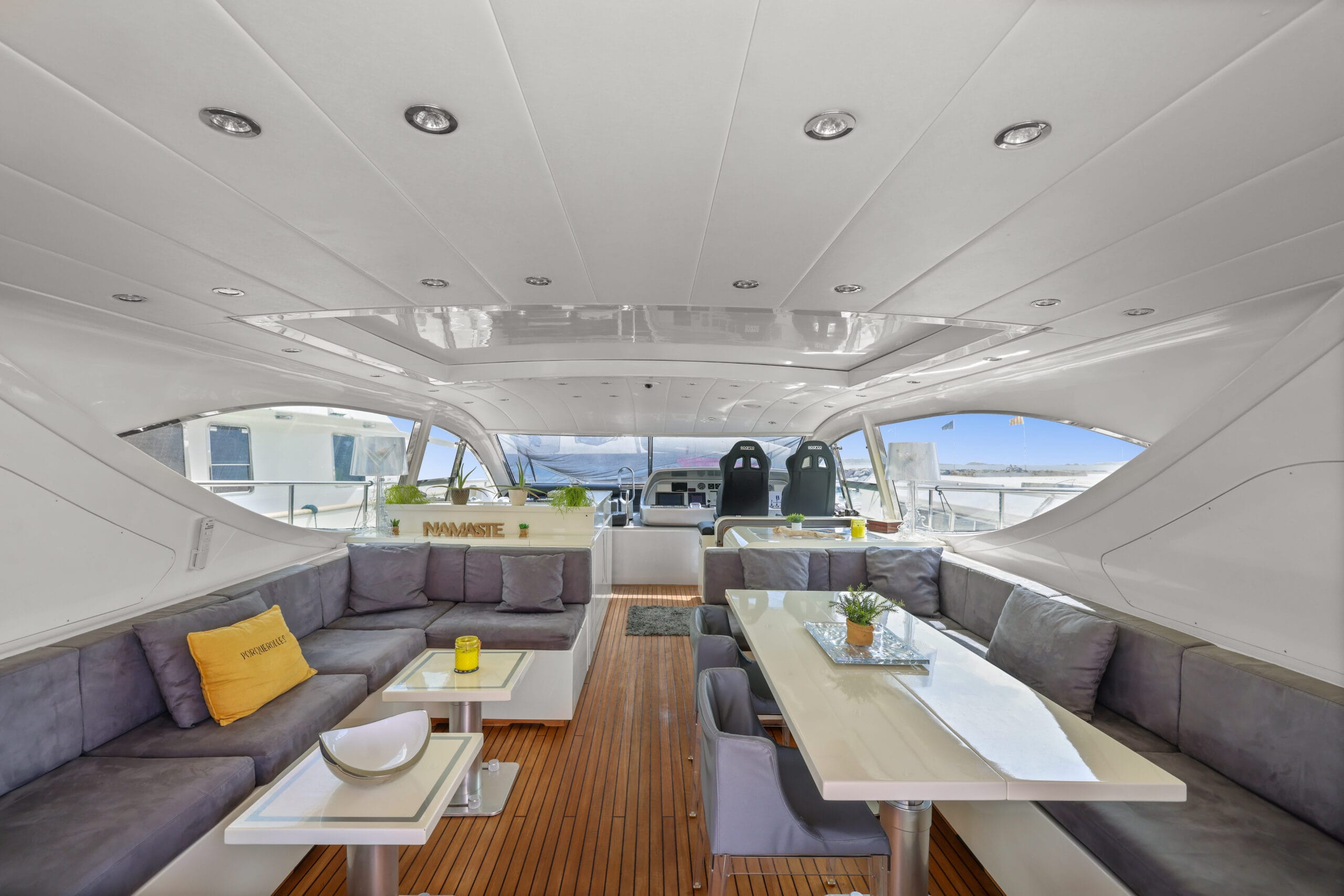 Pensé pour la vie en plein air, NAMASTE offre de larges bains de soleil, un cockpit accueillant et une circulation fluide entre les espaces. Son design open style permet de profiter pleinement du soleil méditerranéen, des mouillages turquoise et des moments de partage à bord.