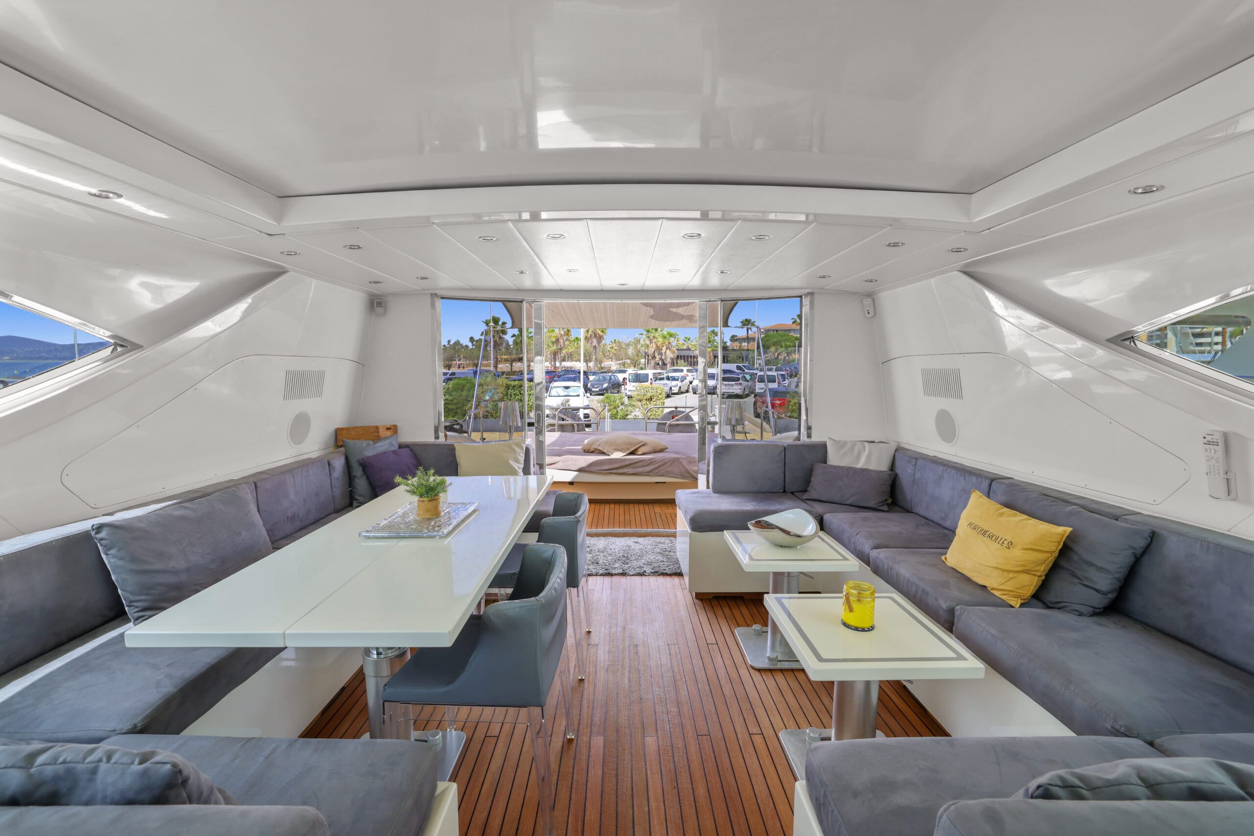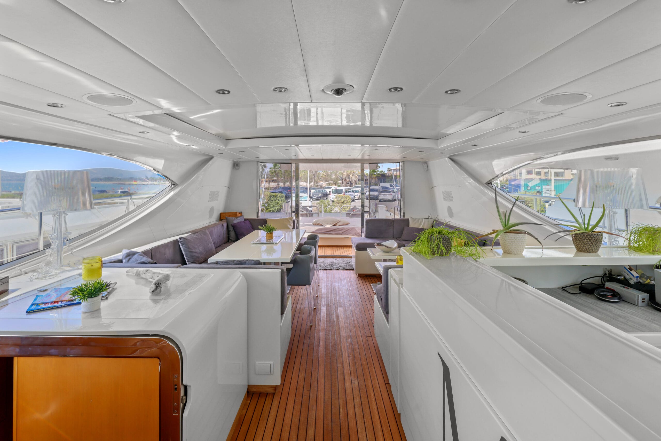 À l’intérieur, trois cabines élégantes et des finitions soignées créent une atmosphère chaleureuse et contemporaine. Les volumes sont optimisés pour offrir un confort rare dans cette catégorie de yachts ouverts, parfait pour les sorties à la journée avec équipage.
