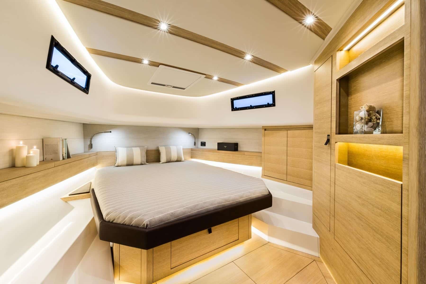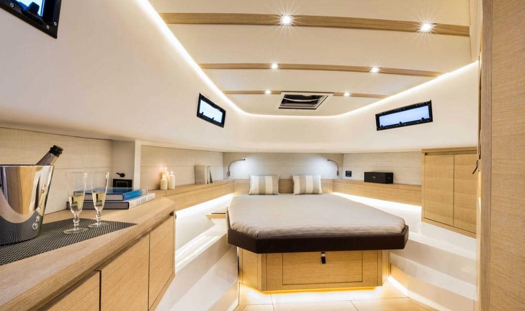 Sous le pont, le Pardo 43 dévoile une cabine propriétaire lumineuse, une seconde cabine double et une salle d’eau chic et fonctionnelle. Les matériaux nobles et le design épuré créent une atmosphère contemporaine, idéale pour prolonger l’escapade en mer.