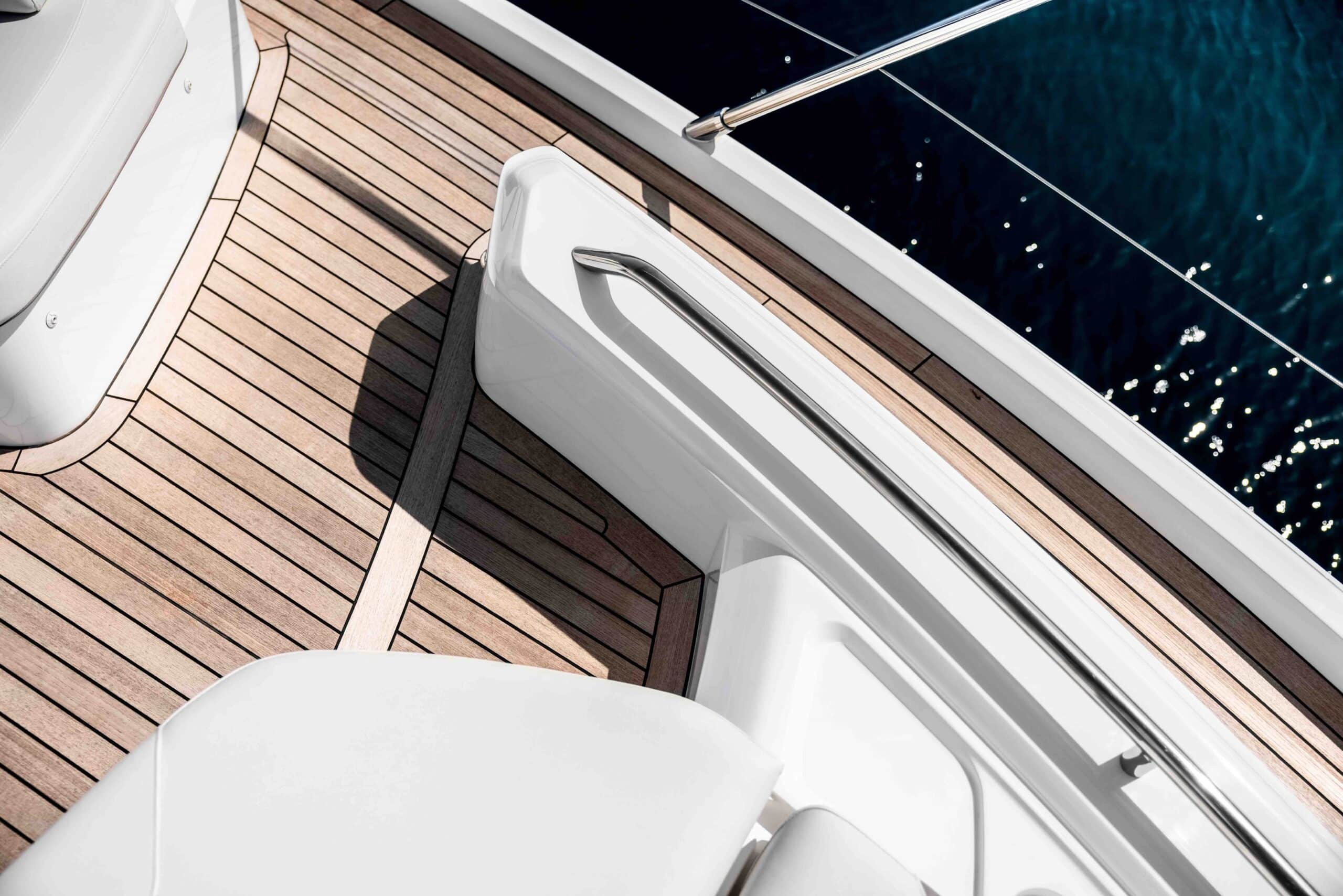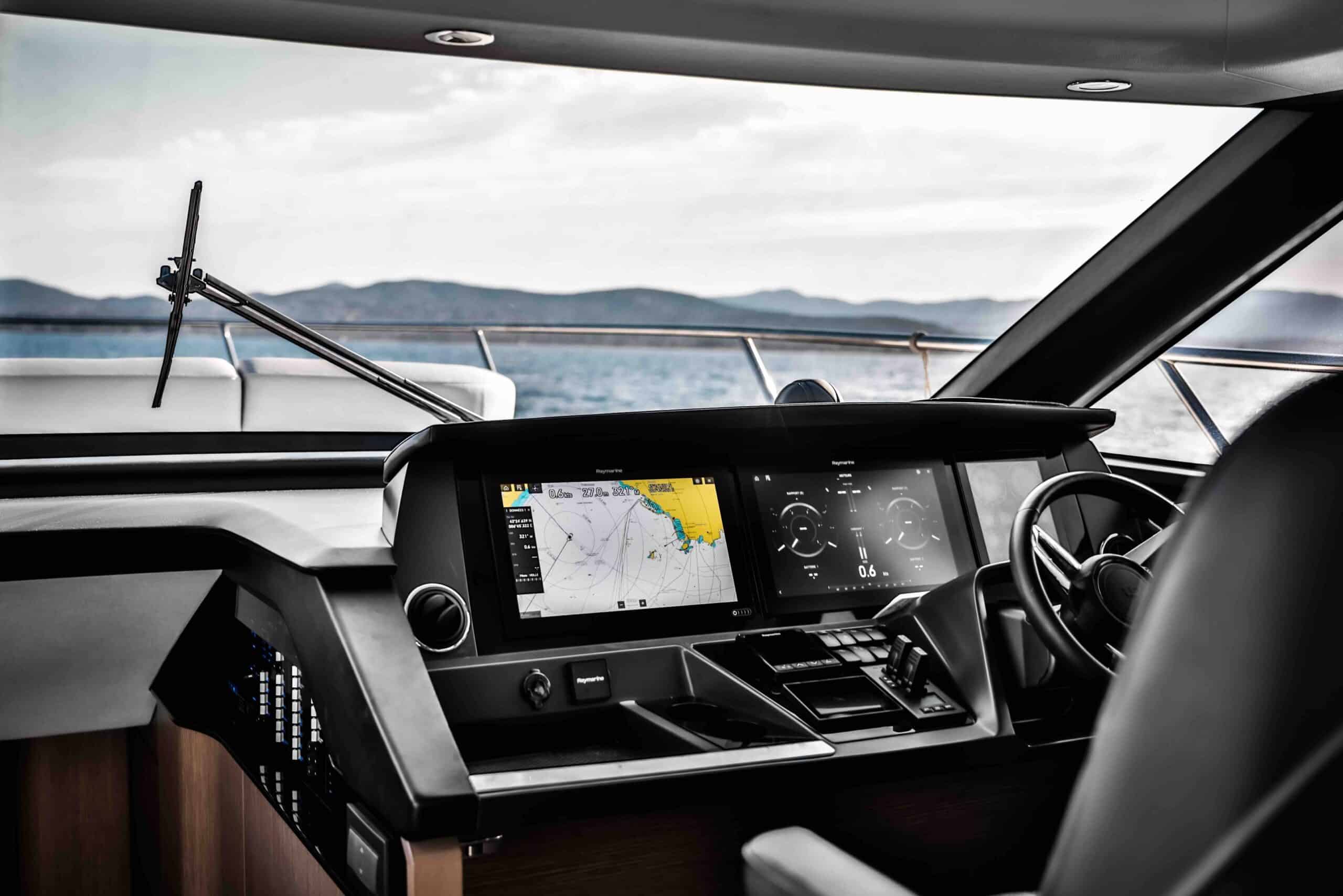 Le vaste cockpit arrière accueille un coin repas ombragé et de grands bains de soleil, parfaits pour des moments de détente en mer. Le flybridge, équipé d’un second poste de pilotage, d’un bar et d’un lounge panoramique, offre un espace privilégié pour admirer les plus beaux paysages de la Méditerranée.