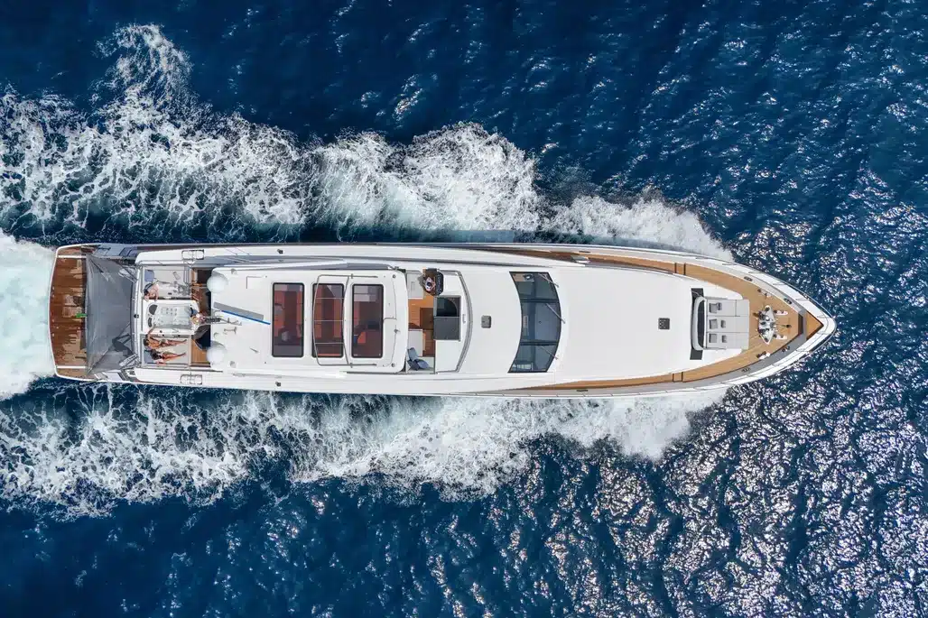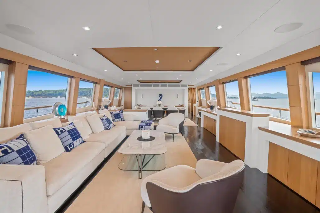 Disposition optimisée avec un salon principal lumineux, un flybridge majeur dans l’expérience à bord, et 5 cabines confortables réparties pour maximiser l’intimité des invités.