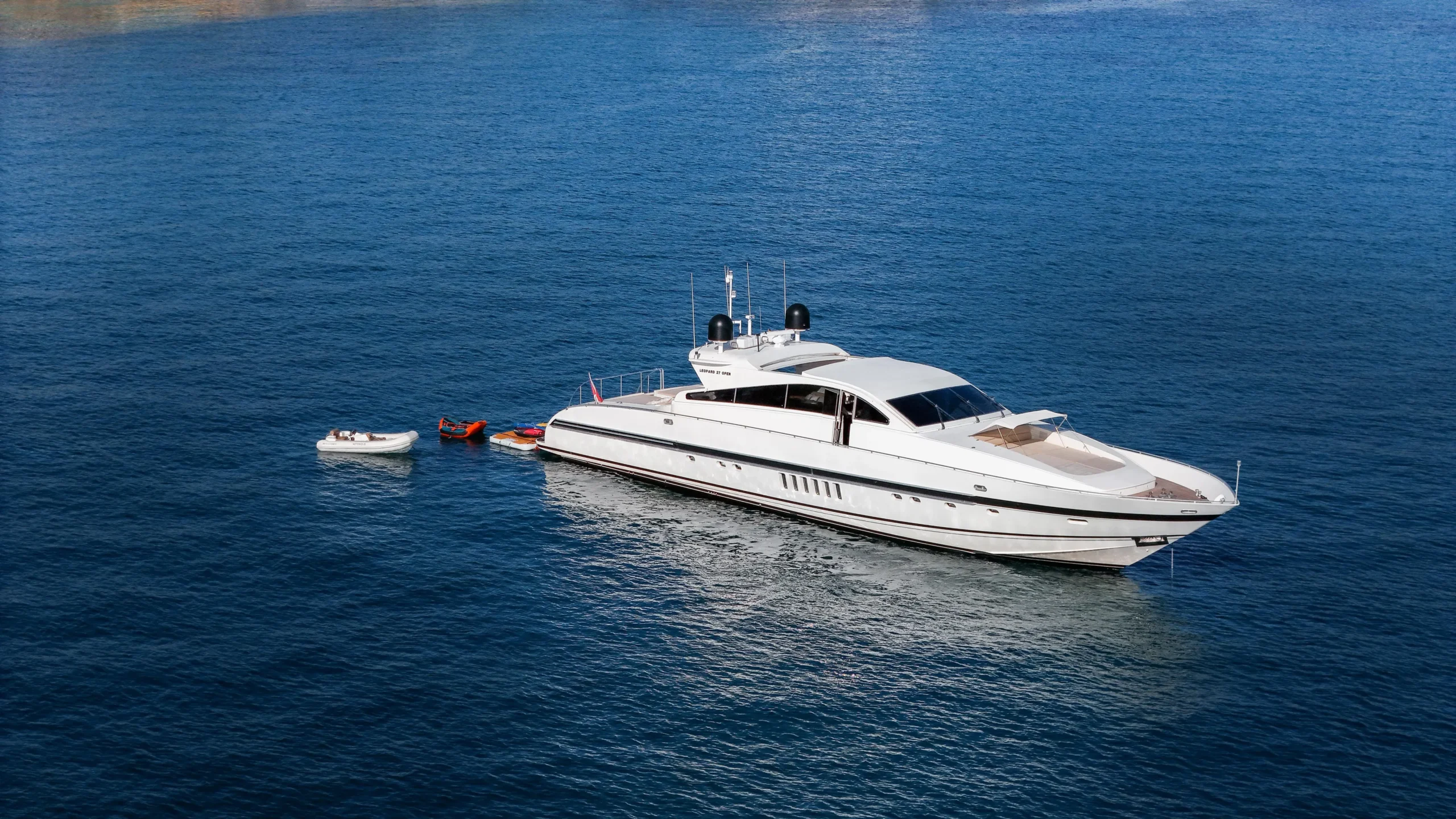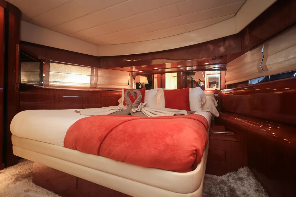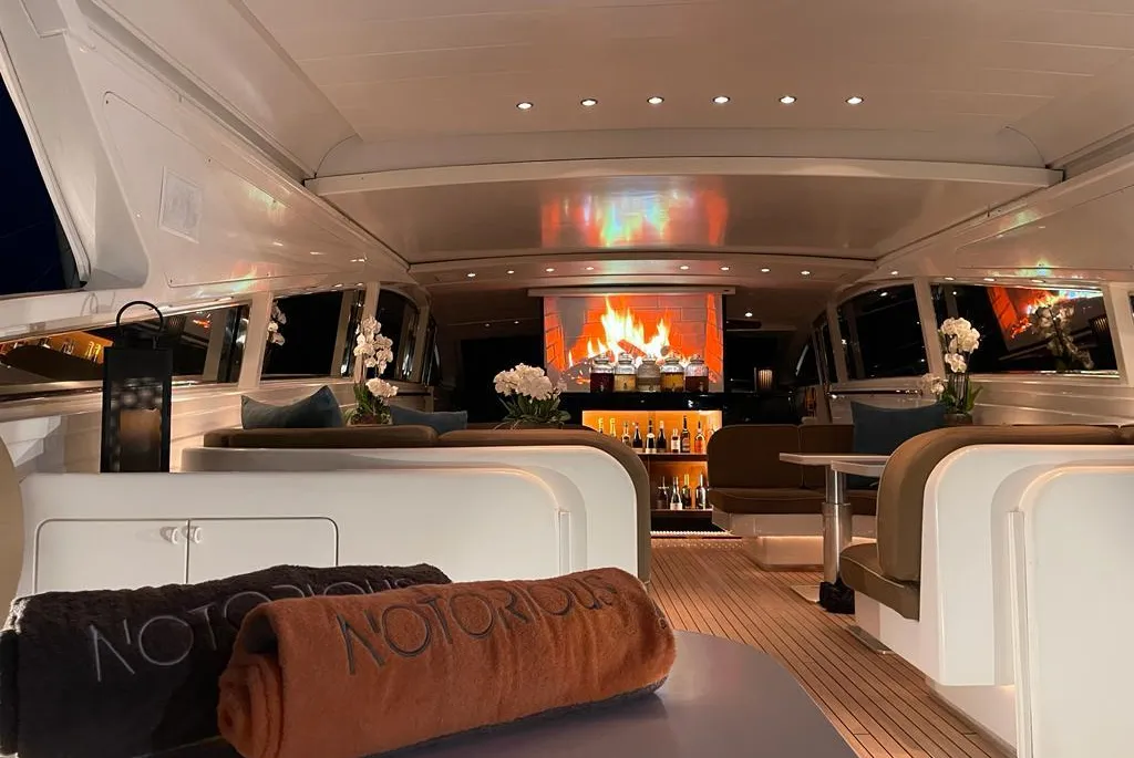 Ses espaces extérieurs généreux, sa plateforme de bain hydraulique, ses stabilisateurs d’ailerons et son équipement complet (jouets nautiques, éclairages sous-marins, cinéma, piste de danse) en font une plateforme idéale pour croisières rapides, journées en mer haut de gamme ou événements.