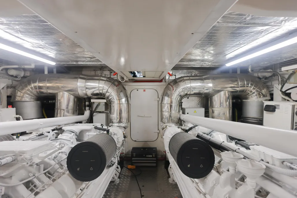 Propulsé par 2 x MTU M90 de 1850 ch, avec transmissions surface drive, il offre une navigation rapide et stable, atteignant jusqu’à 30 nœuds. L’ensemble mécanique a été suivi par un équipage professionnel, avec boîtes de vitesses entretenues et nouveaux générateurs installés.